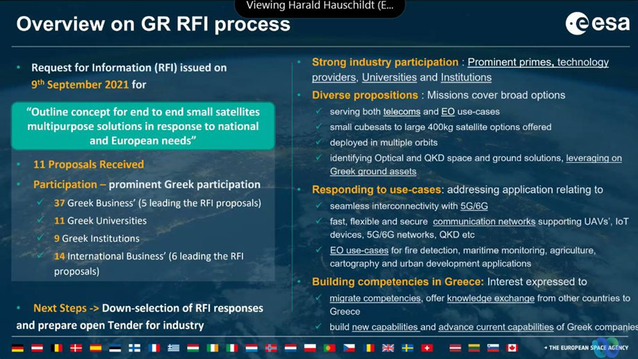Ειδικότερα, το ΥΨΗΔ μέσω της έκδοσης της ανοιχτής πρόσκλησης για προτάσεις ενδιαφέροντος (Πρόσκληση RFI), κινητοποίησε ηγέτιδες εταιρίες (Large Systems Integrators και Primes) της Ευρωπαϊκής Διαστημικής αγοράς οι οποίες κατέθεσαν προτάσεις με την εξαιρετικά αυξημένη συμμετοχή της εγχώριας διαστημικής βιομηχανίας. Συνολικά, με βάση τα αποτελέσματα που ανακοινώθηκαν κατατέθηκαν 11 προτάσεις από τις οποίες 5 ηγούνται από Ελληνικές εταιρίες! Στο σύνολο των προτάσεων συμμετέχουν 37 Ελληνικές εταιρίες, 9 Ελληνικά ερευνητικά Ινστιτούτα και 11 Ακαδημαϊκοί φορείς αλλά και 14 εταιρίες του εξωτερικού (ηγούνται σε 6 προτάσεις). Τα αποτελέσματα παρουσιάστηκαν σε ειδική ψηφιακή βιομηχανική ημερίδα που πραγματοποιήθηκε στις Βρυξέλες όπου από την Ελληνική πλευρά συμμετείχε ειδική επιτροπή του ΥΨΗΔ υπό τον Γενικό Γραμματέα Τηλεπικοινωνιών και Ταχυδρομείων, κ. Θανάση Στάβερη-Πολυκαλά ο οποίος και έχει πρωτοστατήσει στην ταχύτατη υλοποίηση του έργου αυτού.